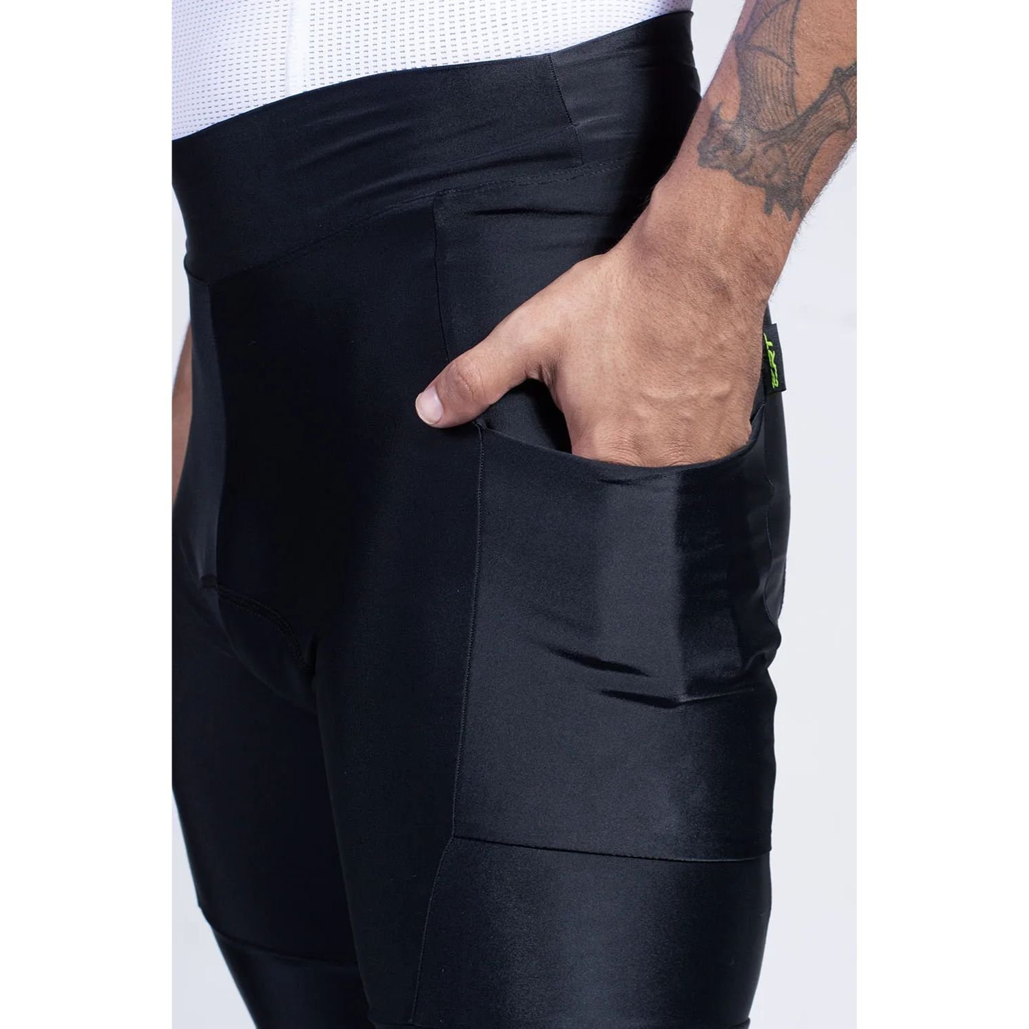 Outro destaque são os dois bolsos laterais nas pernas, discretos e funcionais, que permitem carregar itens essenciais com praticidade durante o pedal.