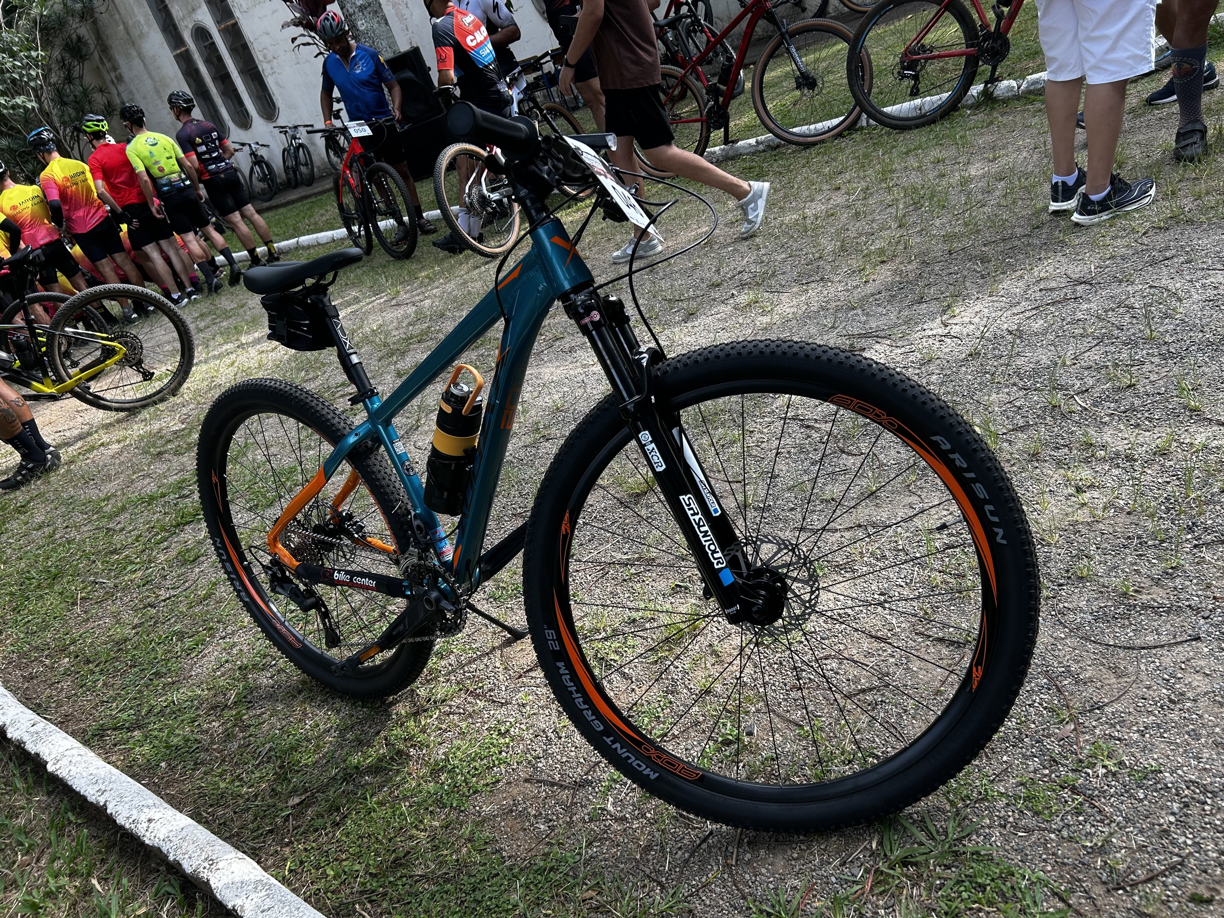 Rodas 29” com pneus Arisun 2.20 – Rendimento, estabilidade e tração para encarar subidas e descidas com segurança.