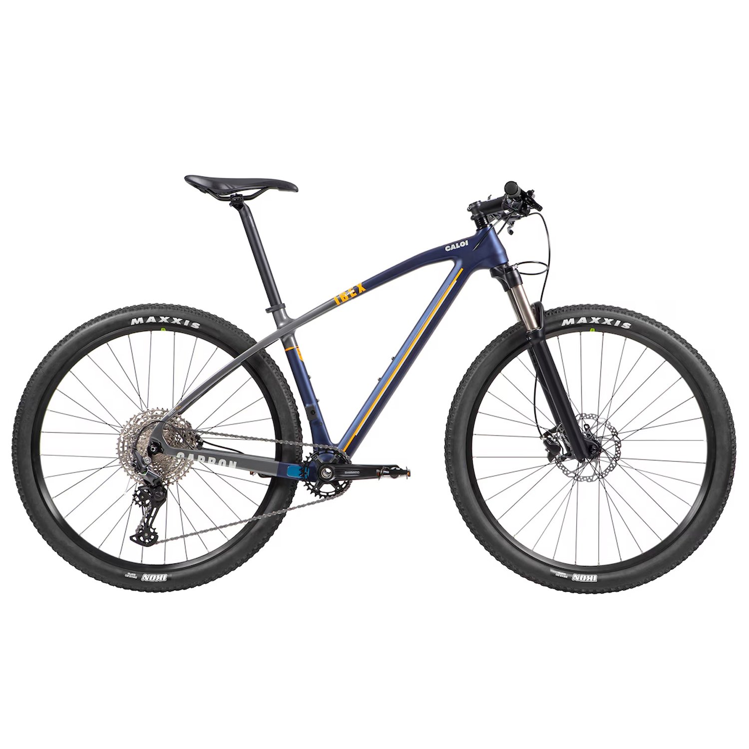 Bicicleta Caloi Carbon Ibex 29 em carbono com Shimano Deore 12v, suspensão a ar com trava no guidão e pneus Maxxis Ikon Tubeless Ready.