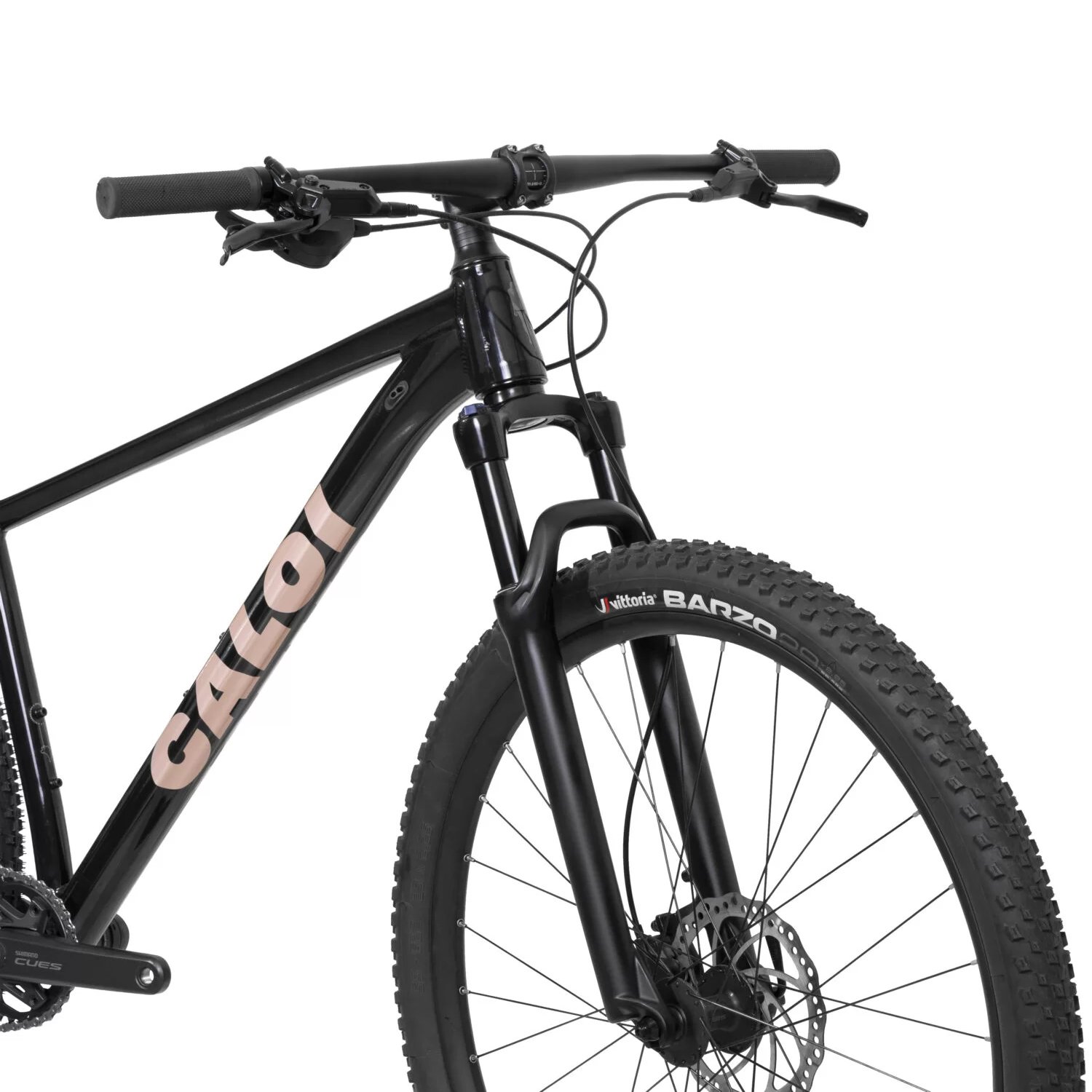 A transmissão Shimano CUES 9V garante trocas precisas e durabilidade, enquanto a suspensão de 100 mm com trava hidráulica proporciona conforto e controle em terrenos variados.