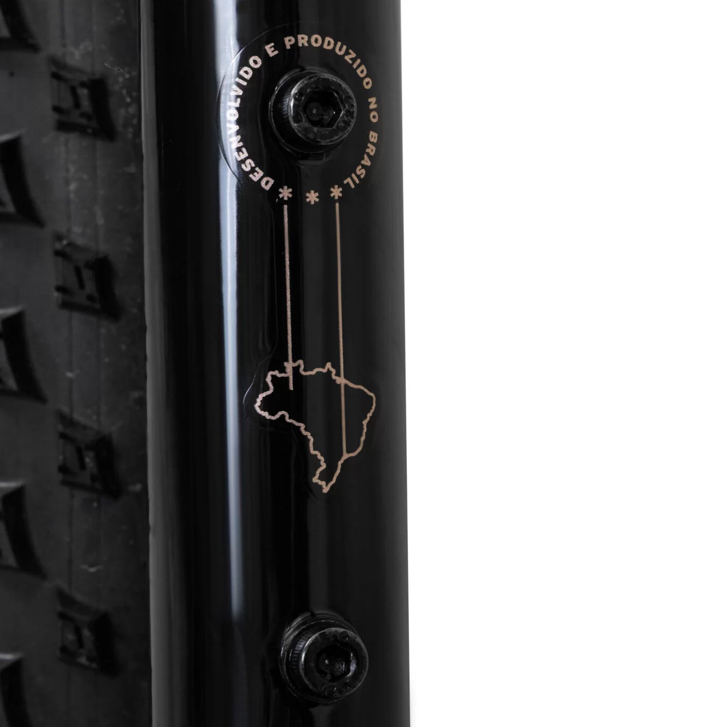 Cabeamento interno e head tube tapered, deixando o visual mais limpo e aumentando a rigidez frontal.