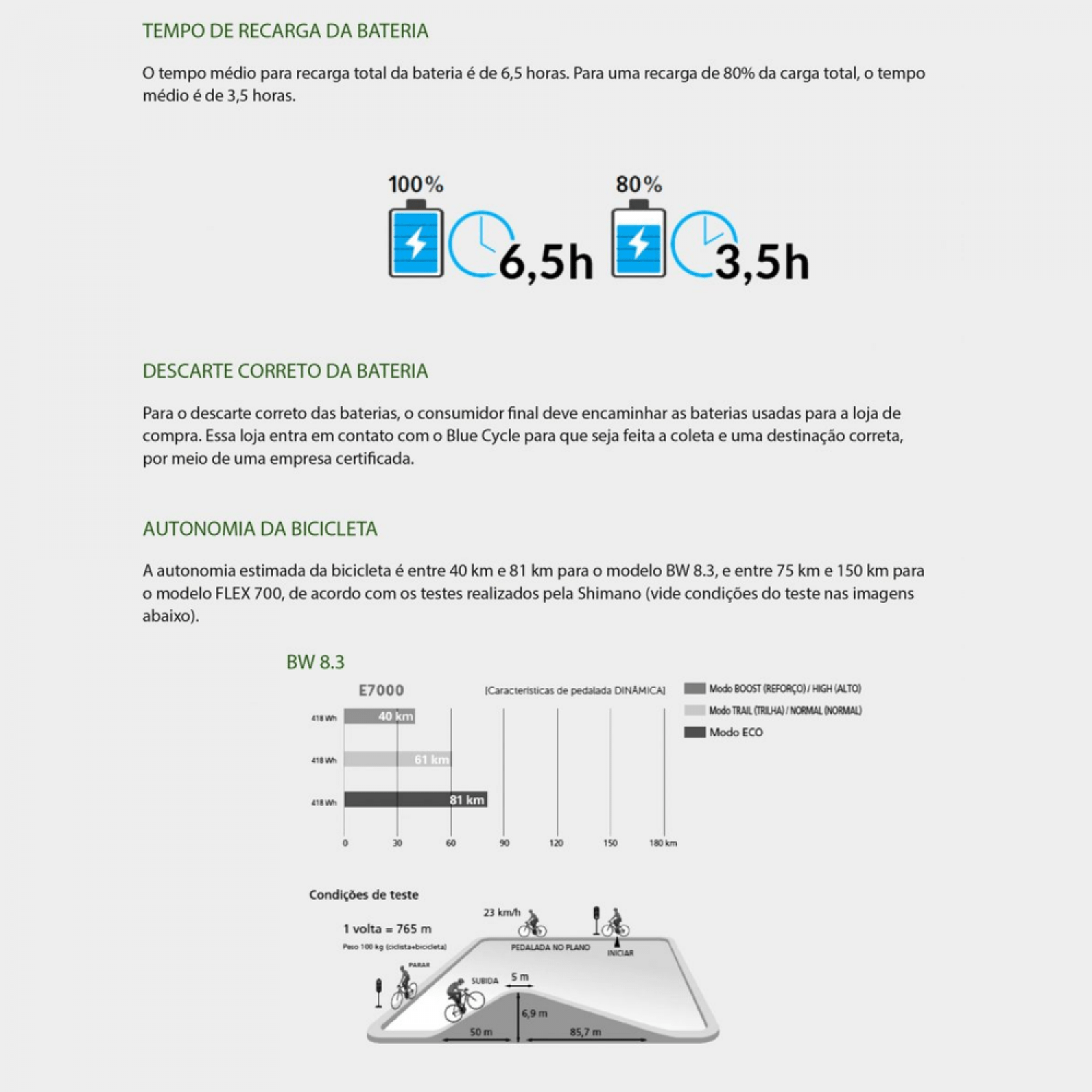 A nova Big Wheel 8.3 2022 está com uma geometria mais moderna, perfeita para trilhas técnicas e descida, mas sem perder agilidade nas subidas. O modelo 2022 vem montada com o potente motor central Shimano E7000 de 250w e Bateria Shimano BT-6010 com autonomia entre 40km e 81km dependendo do modo escolhido. Para dar conta de toda a potencia do motor Shimano, a Big Wheel 8.3 foi equipada com o novo câmbio Shimano Deore M5100 de 11 velocidades, conjunto de freio Deore hidráulico BR-MT410 e a suspensão RockShox Recon Silver RL 29 Solo Air com 100mm de curso.