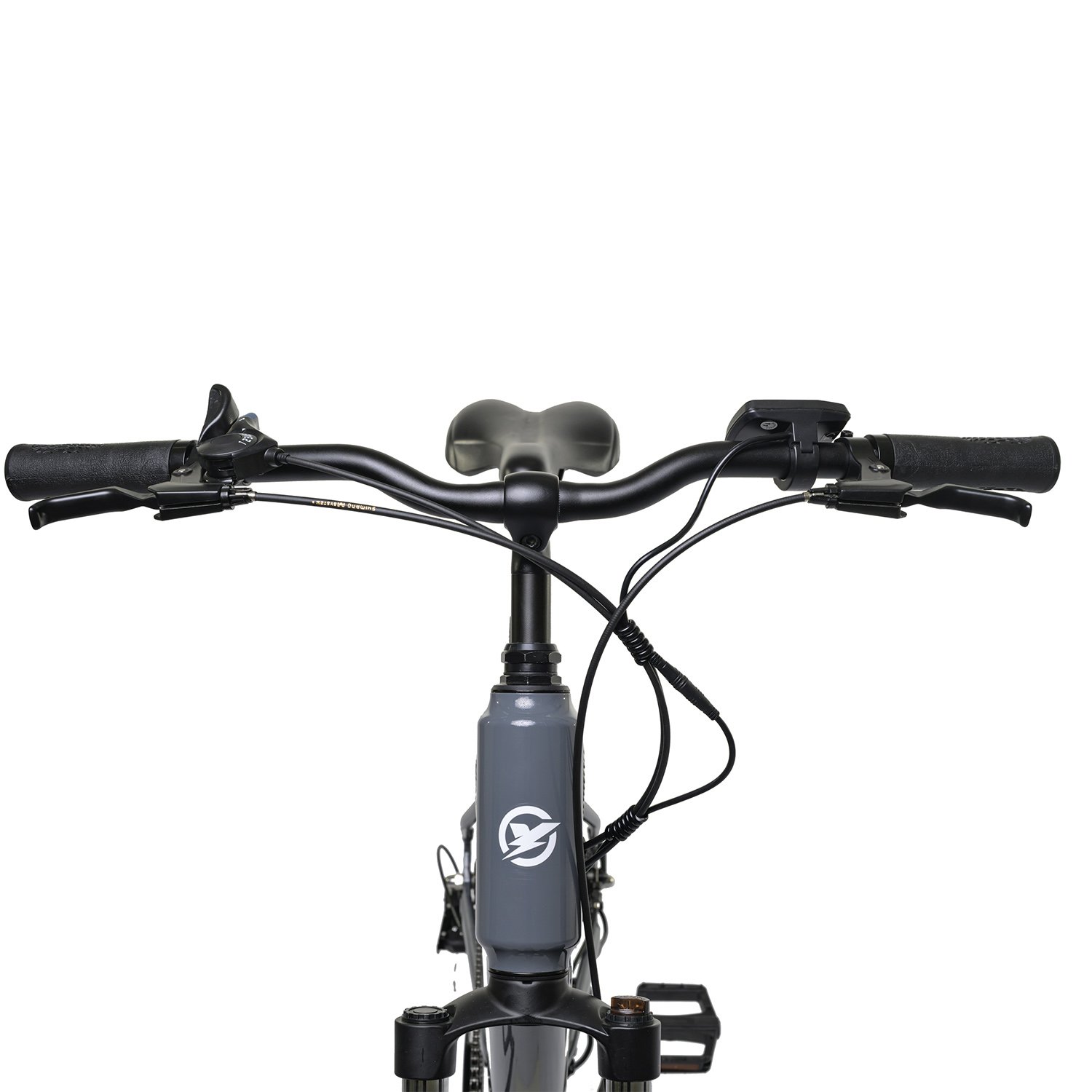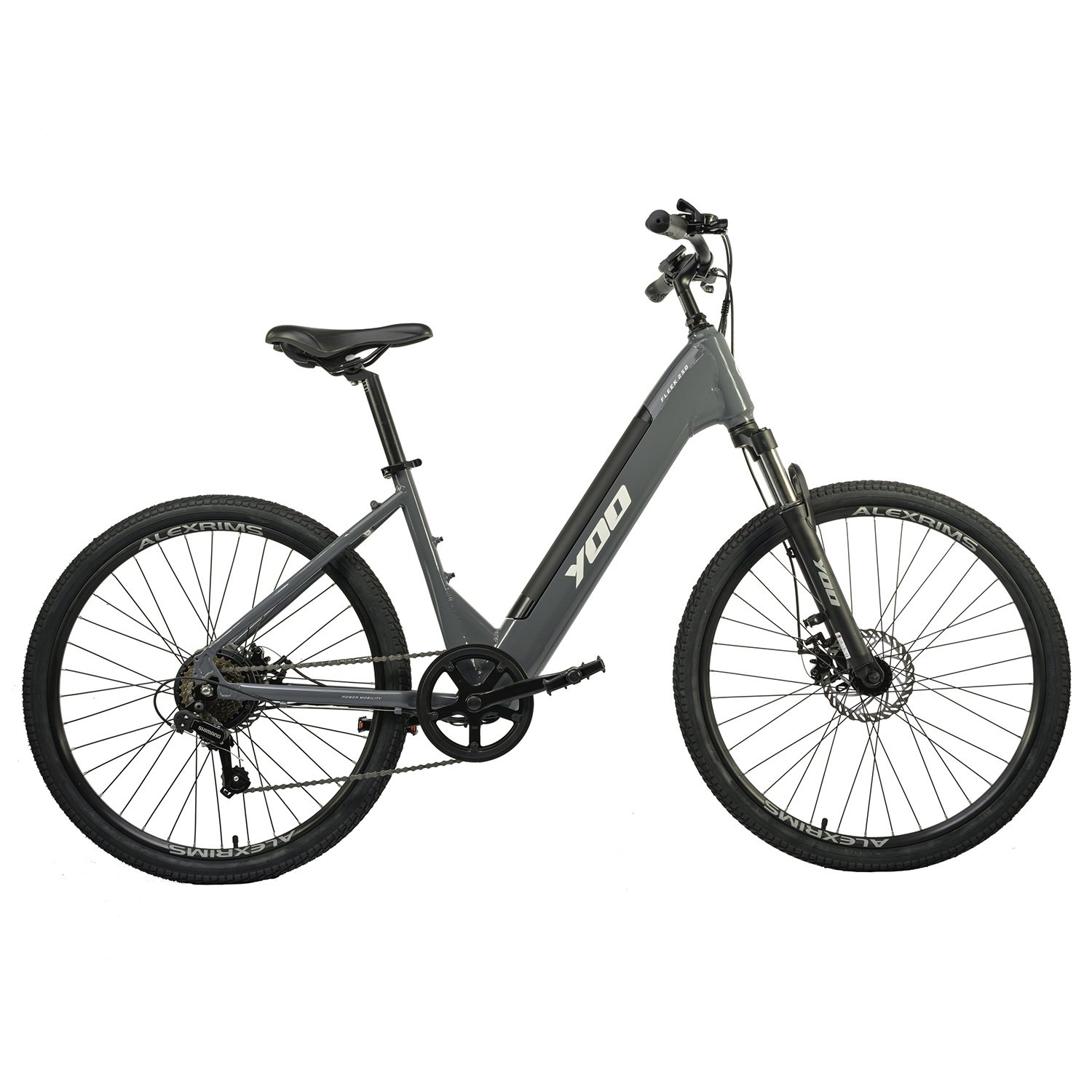Bicicleta elétrica Yoo Fleek 250 aro 26, com quadro em alumínio, câmbio Shimano Tourney 7v, freio a disco mecânico e suspensão dianteira de 90mm.