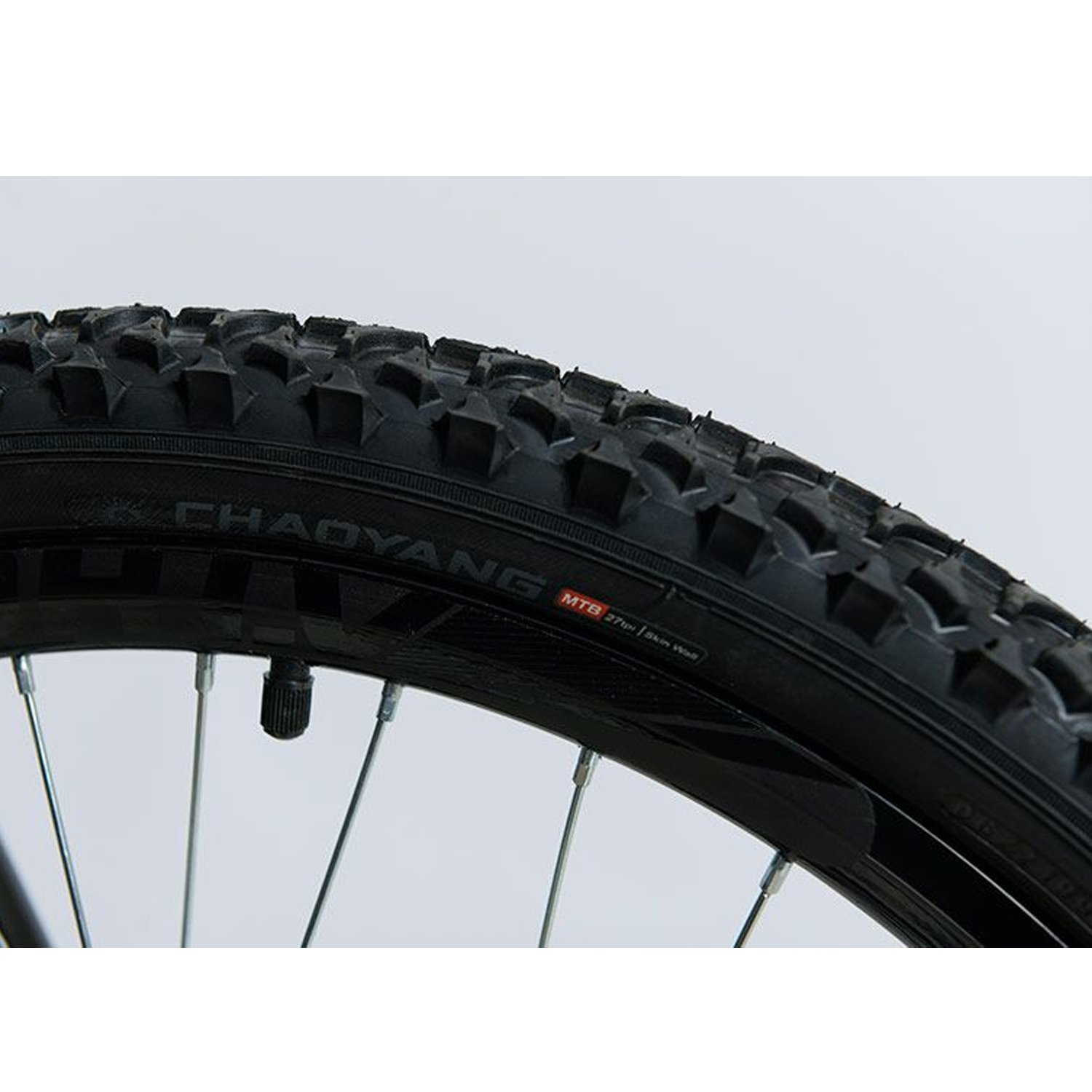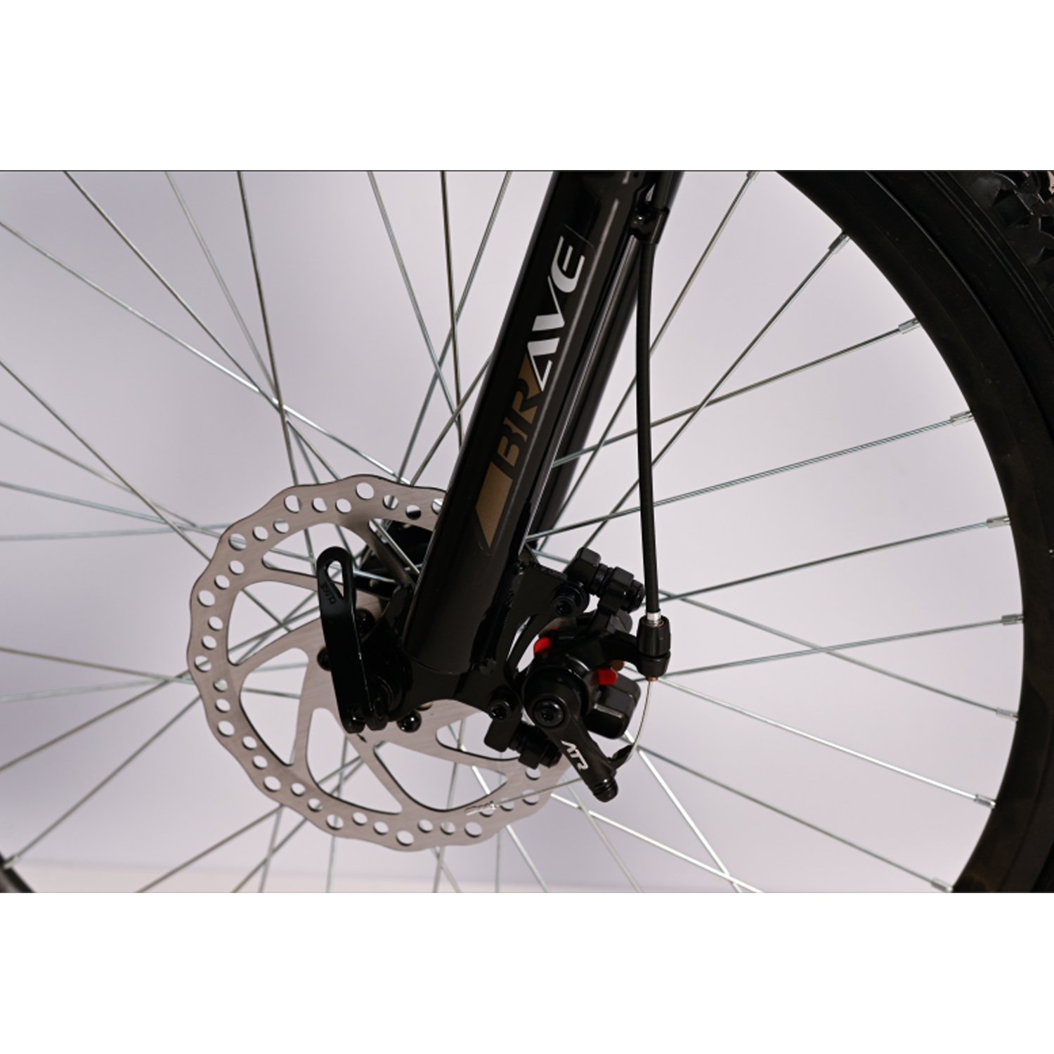 Os freios a disco proporcionam maior força de frenagem e segurança. Já as rodas Aero em alumínio com pneus Chaoyang 24x1.95 oferecem aderência e durabilidade para todo tipo de terreno.