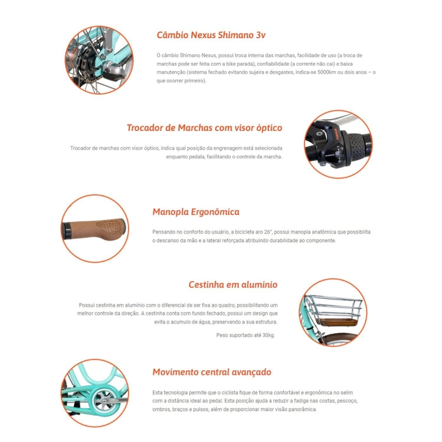 E para completar a Antonella vem equipada com o câmbio Shimano Nexus de 3 velocidades com display, freios V-brake e movimento central avançado, o que deixa a pedalava mais fácil. A cestinha fixa no quadro em alumínio e bagageiro em alumínio garantem espaço de sobra para transportar compras, mochilas, sacolas ou mesmo o material de trabalho nos trajetos diários. Além disso, essa linda bike possui cavalete central de descanso e manoplas anatômicas exclusivas!