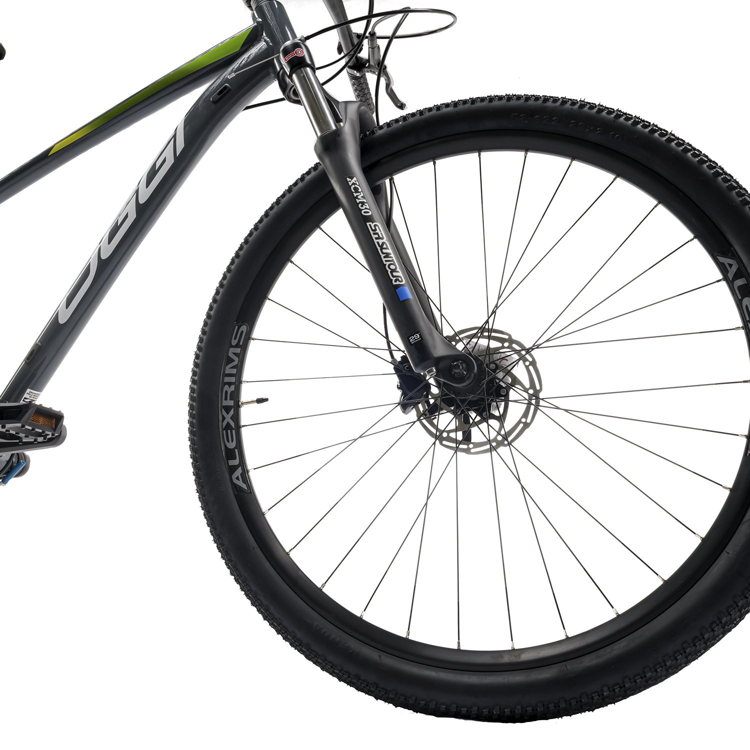 Bicicleta Oggi Big Wheel 7.1 2026 com Shimano CUES 10v, quadro alumínio 6061 com cabeamento interno, suspensão Suntour XCM com trava remota e freios hidráulicos. Ideal para iniciantes no MTB e uso urbano.