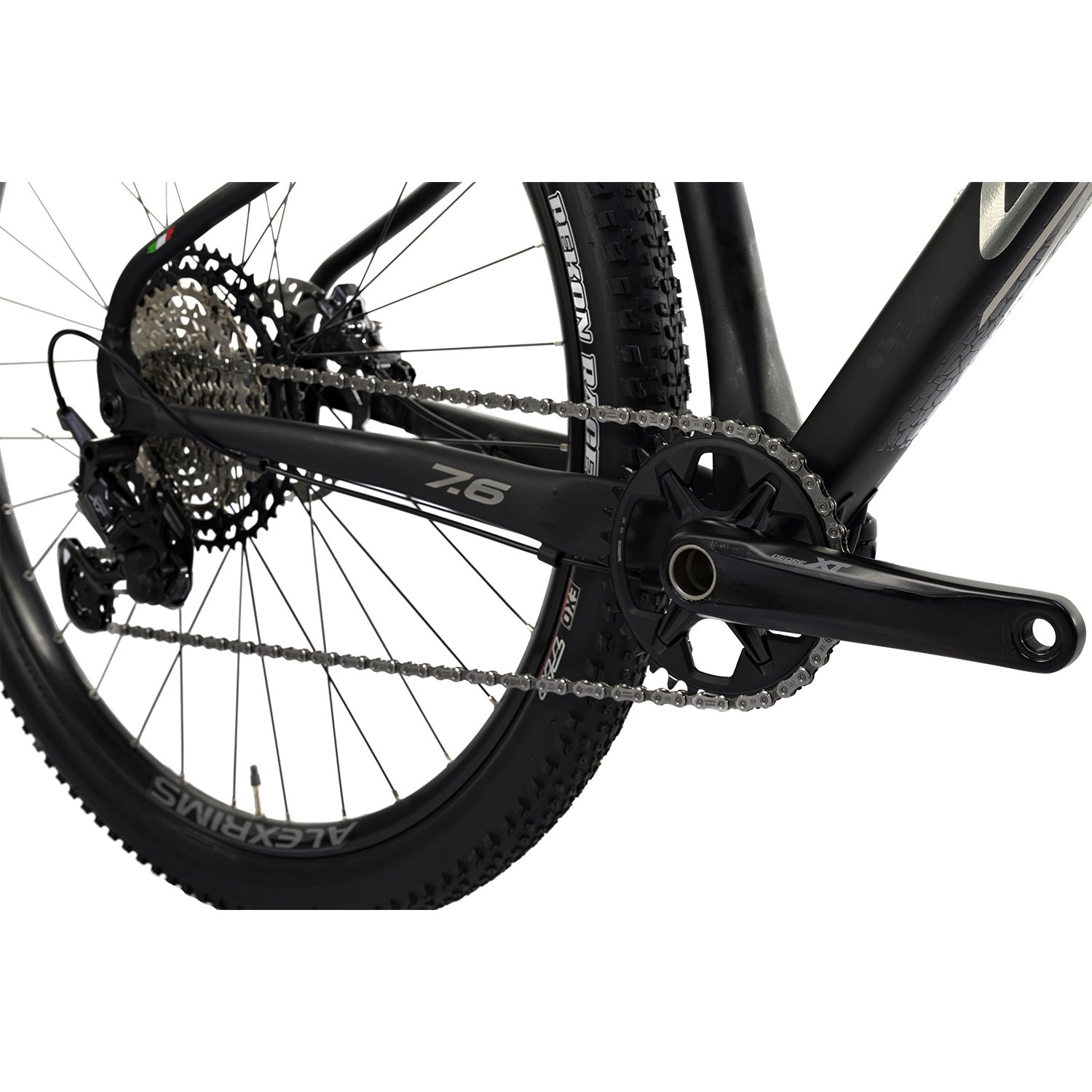 Cubos DT Swiss 370 combinados com aros Alexrims e pneus Maxxis Rekon Race garantem rolagem rápida e excelente tração.