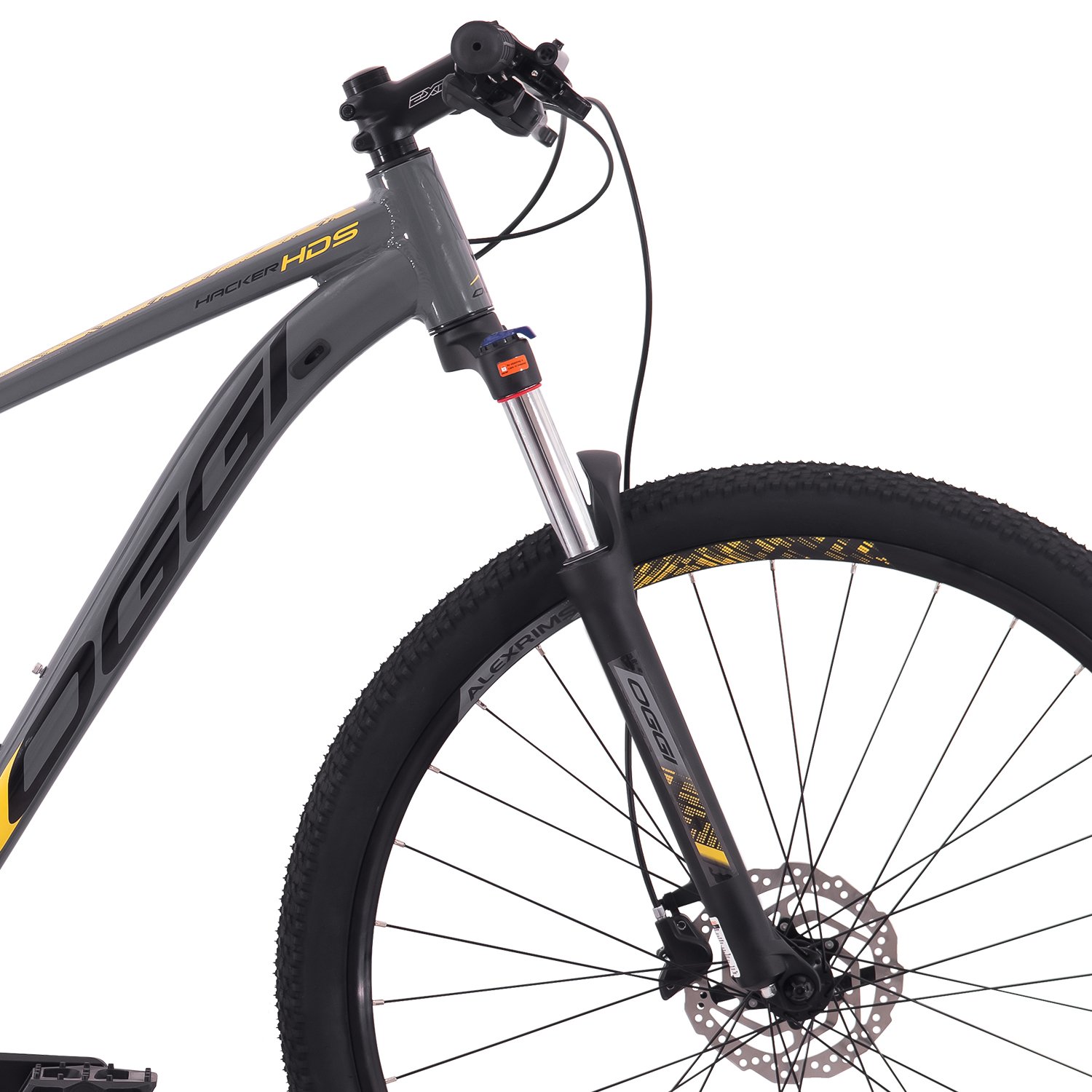 Nova Oggi Hacker HDS 2025 com grupo Shimano Essa 8V, quadro de alumínio com cabeamento interno, suspensão de 100mm e freios a disco hidráulicos. Performance, conforto e segurança para quem busca iniciar no MTB com qualidade.