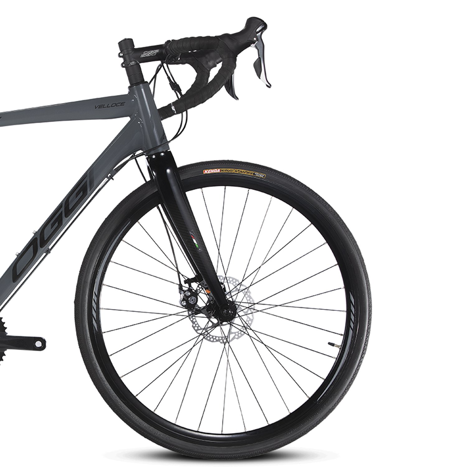 Bicicleta de estrada Oggi Velloce Disc 2024 – Quadro de alumínio, garfo em carbono, Shimano Claris 16v e freios a disco. Estabilidade, segurança e performance para iniciantes no ciclismo de estrada.