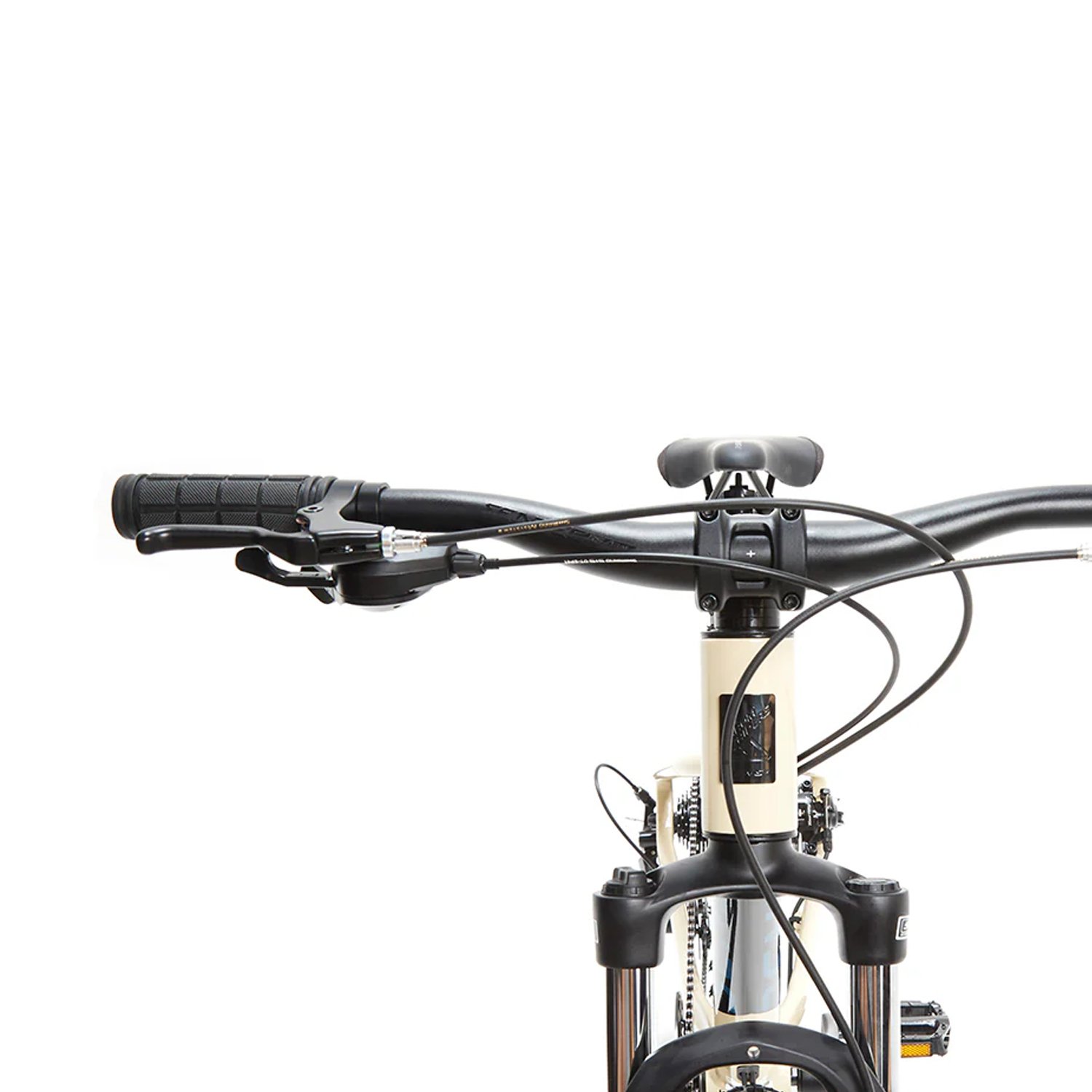 Suspensão dianteira Suntour com 80mm para encarar trilhas leves e passeios urbanos.