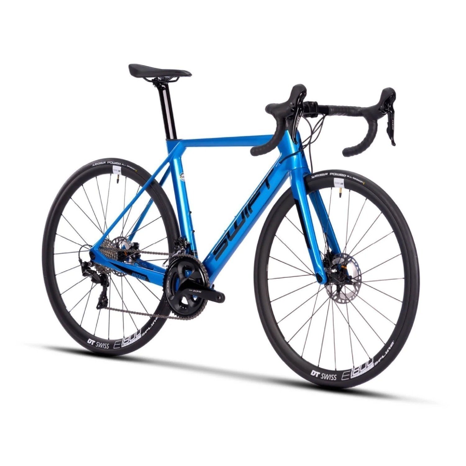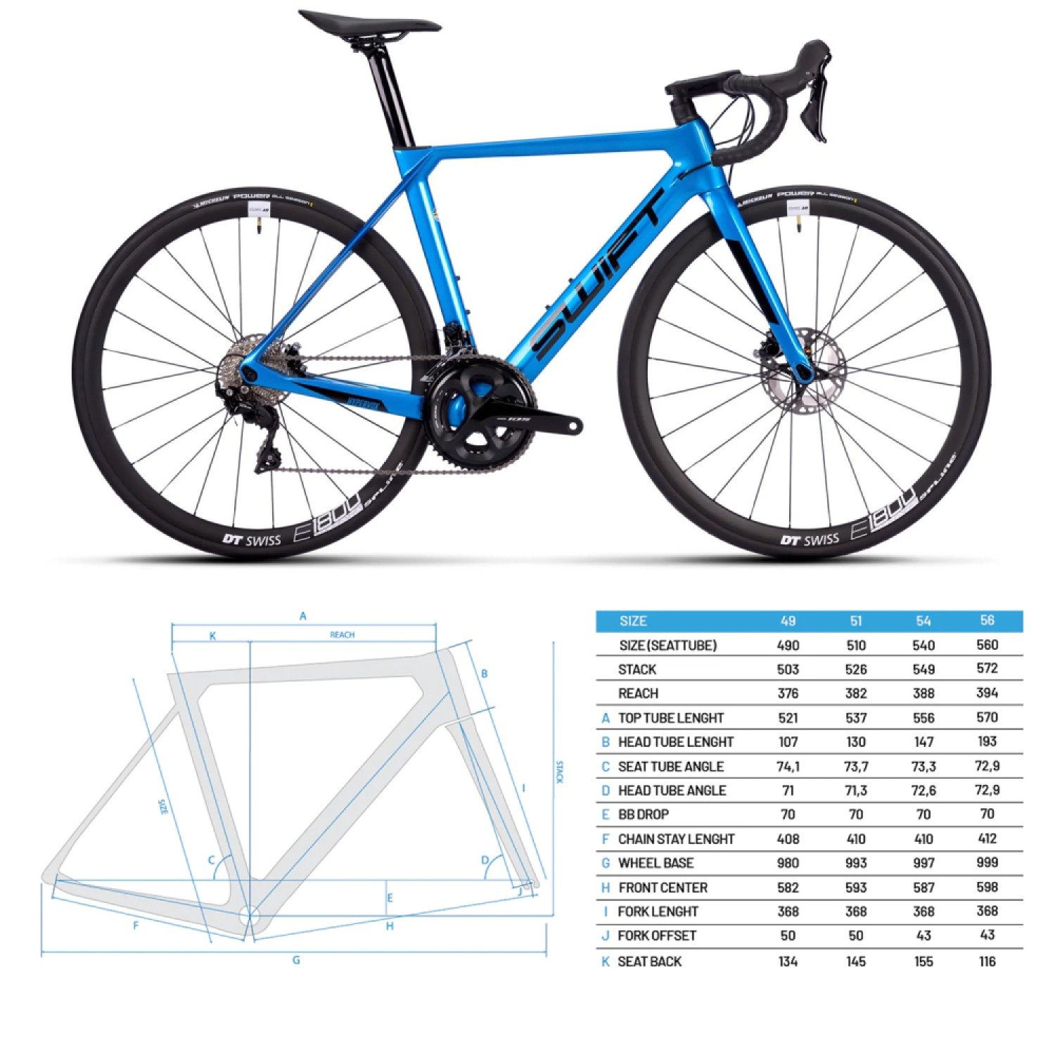 - Guidão: Swift alloy Ergo 7050, 31.8mm, Flare: 4°, Drop: 125mm, Bar Reach:70mm, 400mm (49), 420mm (51/54), 440mm (56), rota interna de cabeamento;