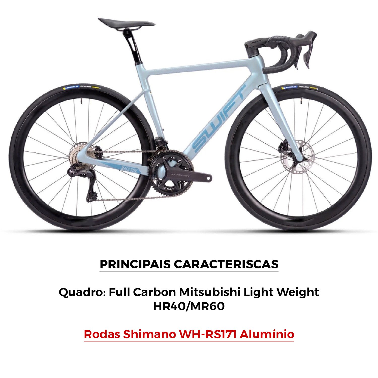 - Guidão: Swift full carbon aero, 31.8mm, Drop: 125mm, Bar Reach:75mm, 400mm (49) – 420mm (51/54) - 440mm (56), rota interna de cabeamento;