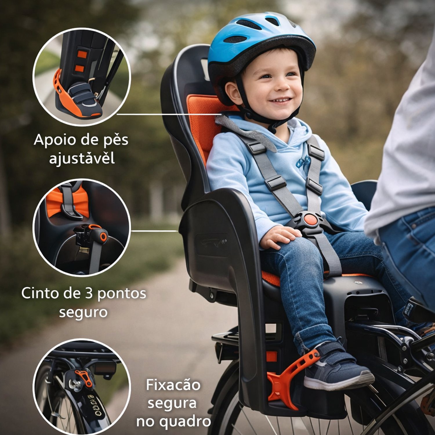 Cadeirinha infantil Polisport Wallaroo FF traseira para bicicleta, suporta até 22kg, com cinto de 3 pontos, apoio ajustável e fixação no quadro. Segurança e conforto para pedalar