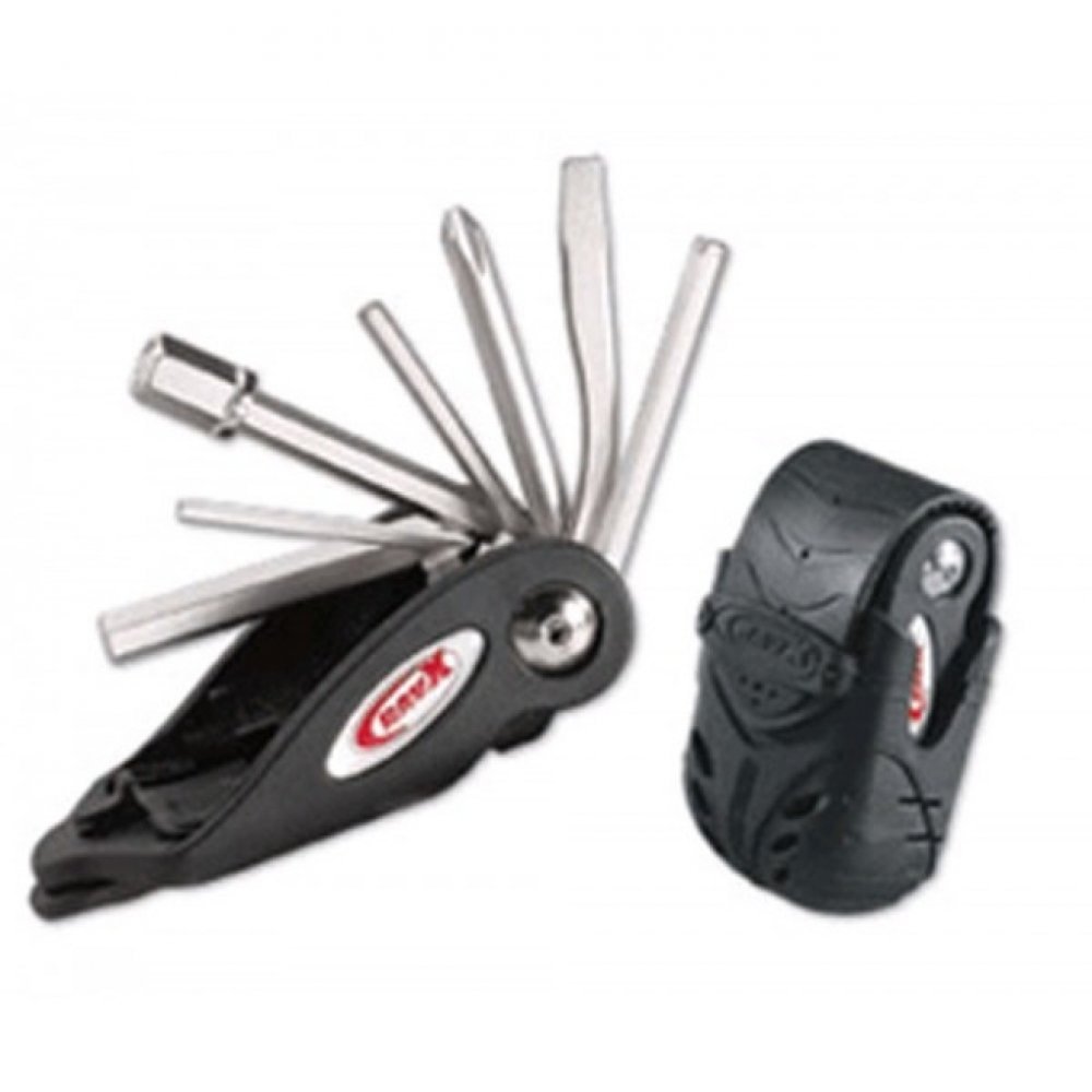 Mult-X, 11 Ferramentas essenciais para ciclistas, 6 Chaves Allen: 2.5 e 8mm, 2 Chaves de fenda : 1 Phillips e 1 Lisa, 2 Espatulas de pneus, Liberação de ar válvula Shrader, Dimensões: (C x L) 75 x 40mm, Peso: 105gr, Aço inoxidável.Especificações: