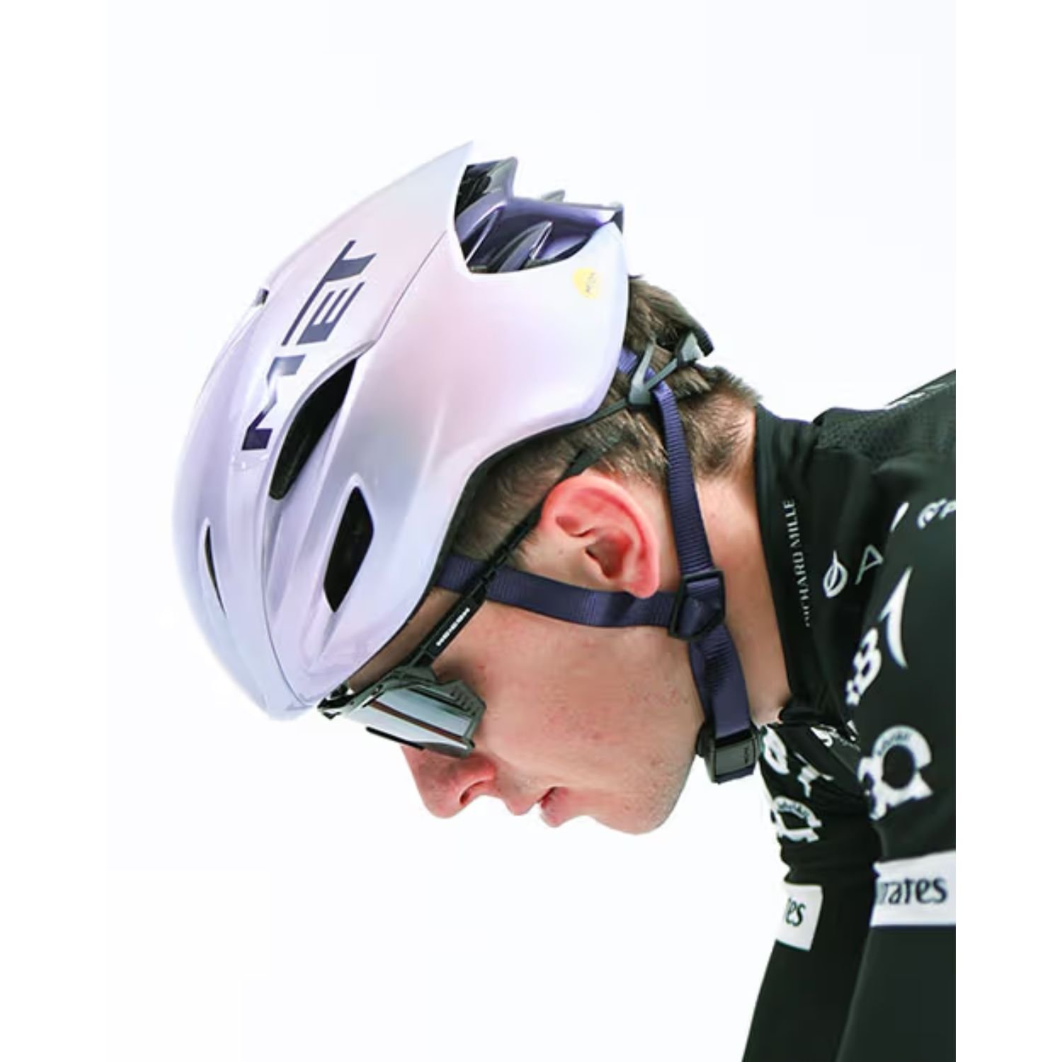 O Capacete MET Manta Tadej Pogačar Edição Limitada combina aerodinâmica de nível WorldTour, sistema MIPS C2® e design iridescente exclusivo inspirado no campeão do ciclismo mundial.