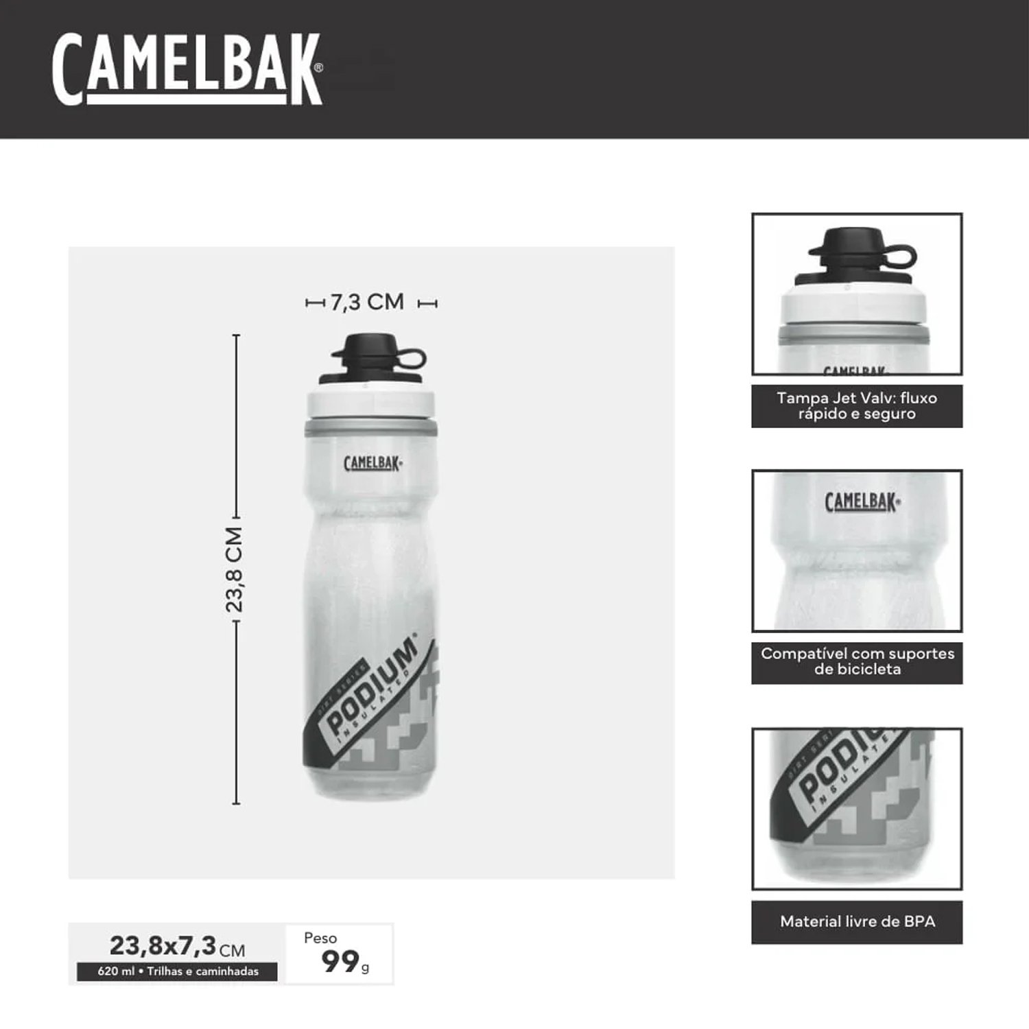 A CamelBak Podium Dirt Series Chill 620 ml foi desenvolvida para ciclistas que pedalam em trilhas, estradas ou competições e não abrem mão de hidratação eficiente e água gelada por mais tempo. Seu design térmico com parede dupla mantém a bebida fria por até duas vezes mais tempo, enquanto a tampa Dirt Series protege o bico contra lama, poeira e sujeira, garantindo higiene total mesmo nas condições mais extremas.