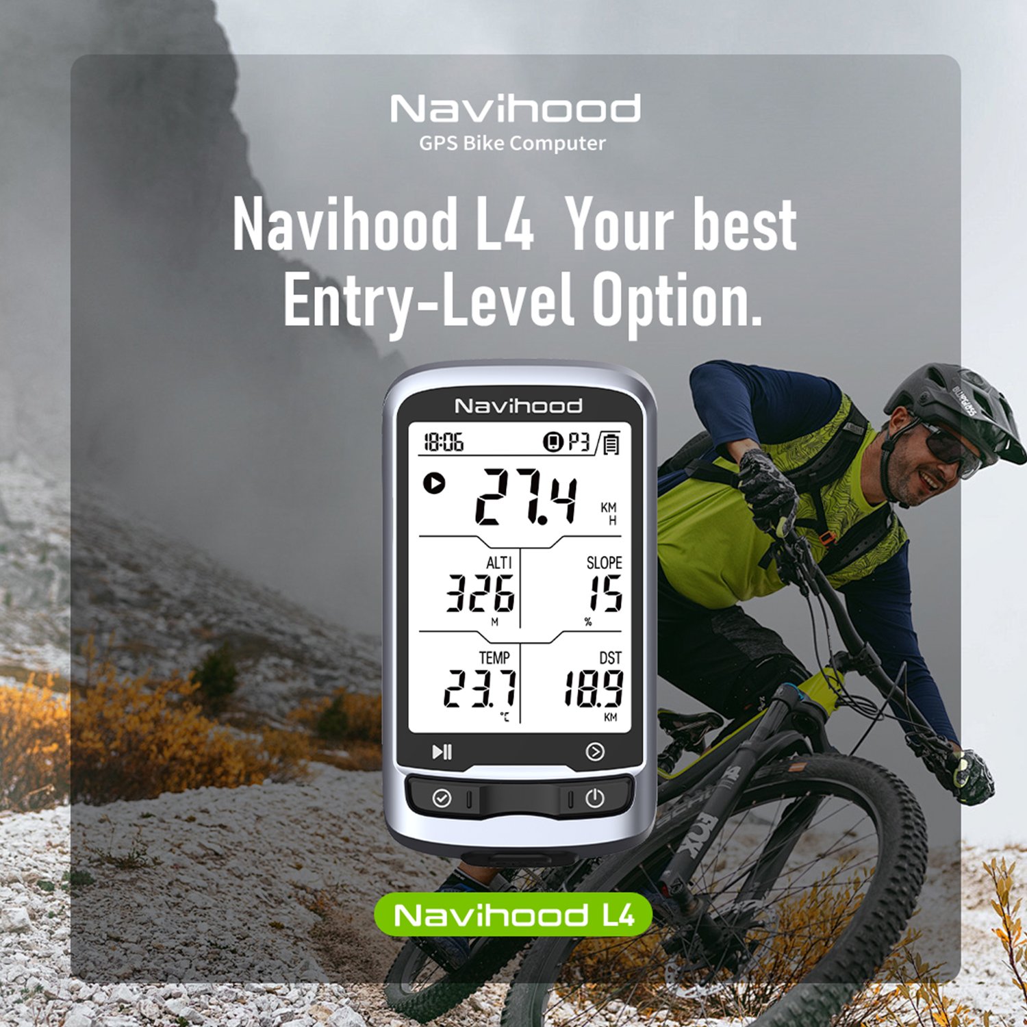 Ciclo computador GPS Navihood L4 com tela 2.3”, 25 métricas, ANT+, Bluetooth, 22h de bateria e resistência IPX7.