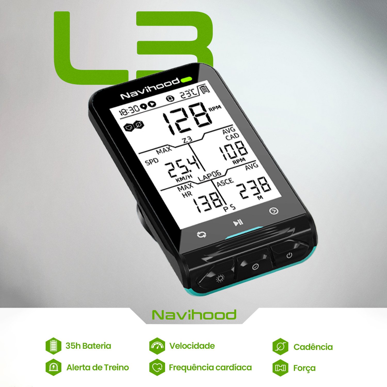 Ciclo computador GPS Navihood L3 com tela 2.6” espelhada, 35h de bateria, ANT+ e Bluetooth, 38 métricas e resistência IPX7.