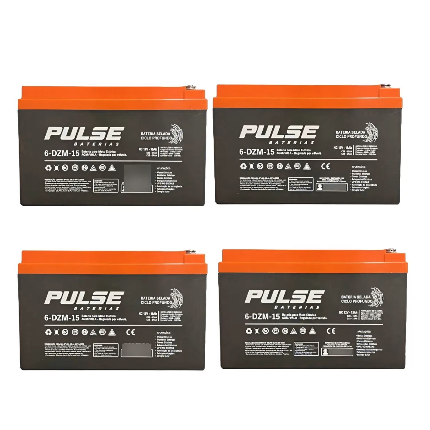 Kit com 4 baterias Pulse Gel VRLA 12V 15Ah 6-DZM-15. Seladas, livres de manutenção e ideais para bikes elétricas, patinetes e mobilidade elétrica.