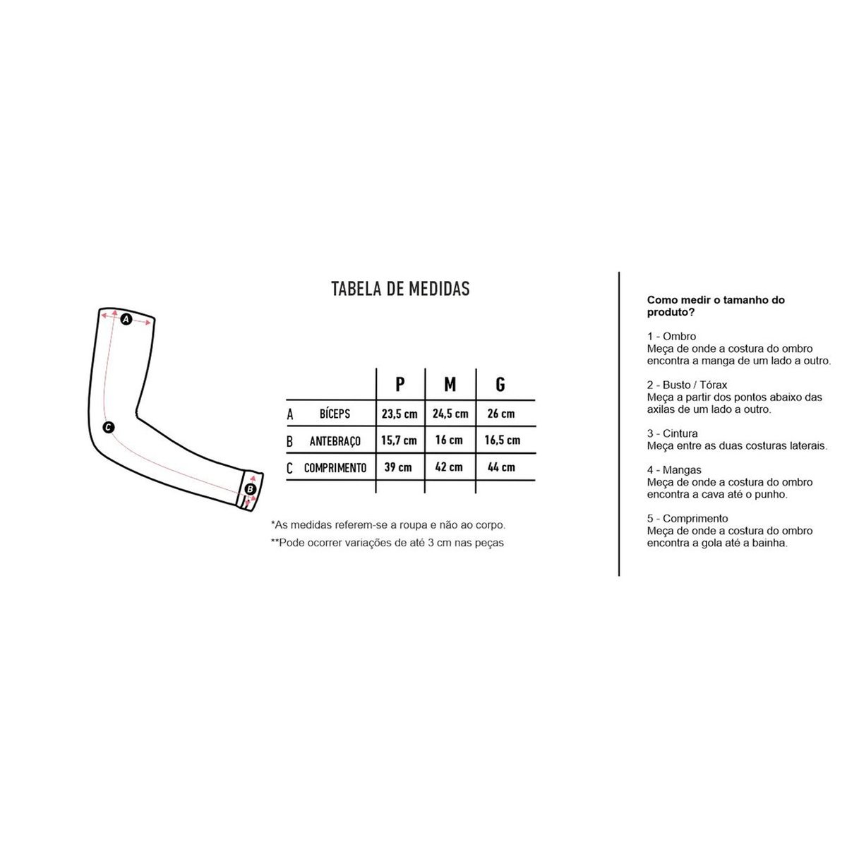 - Tamanhos Disponíveis: P, M e G;