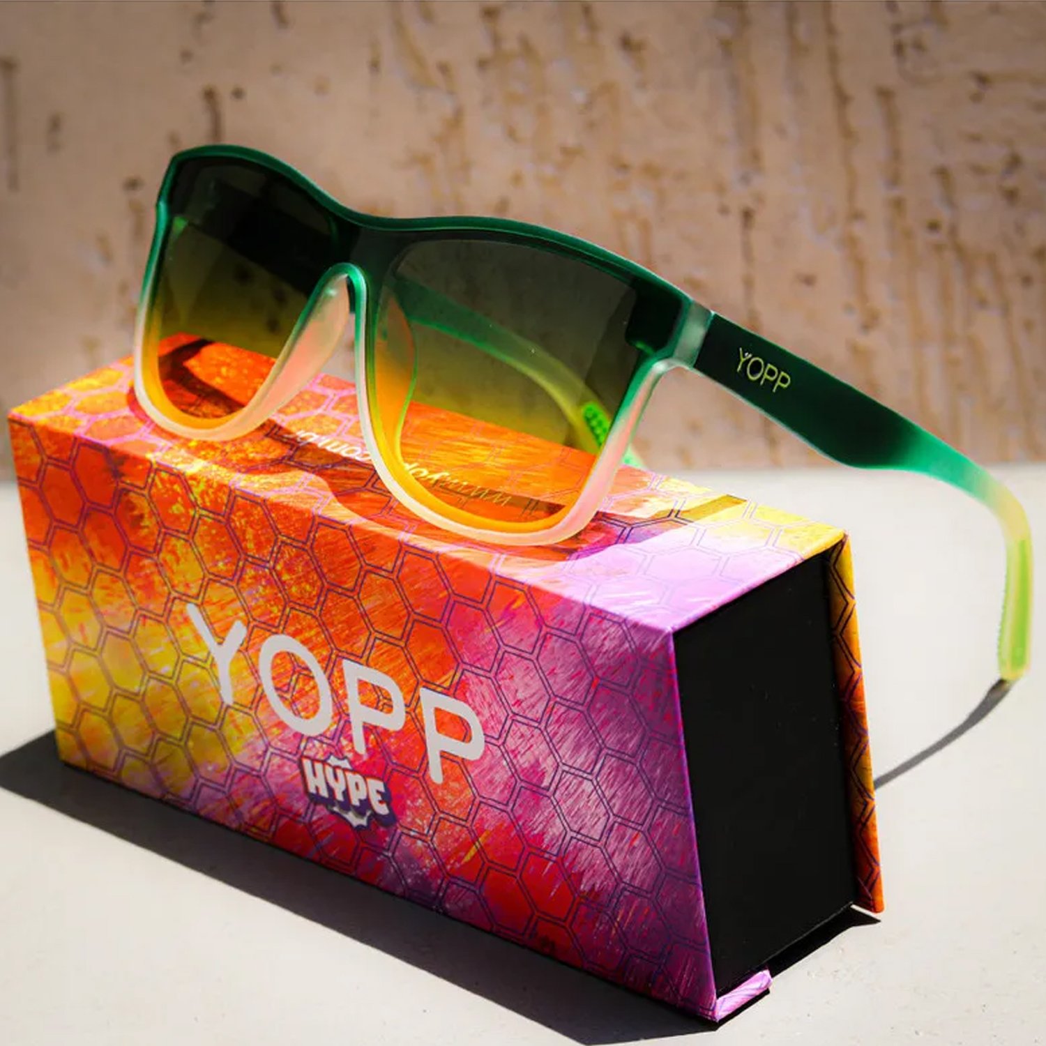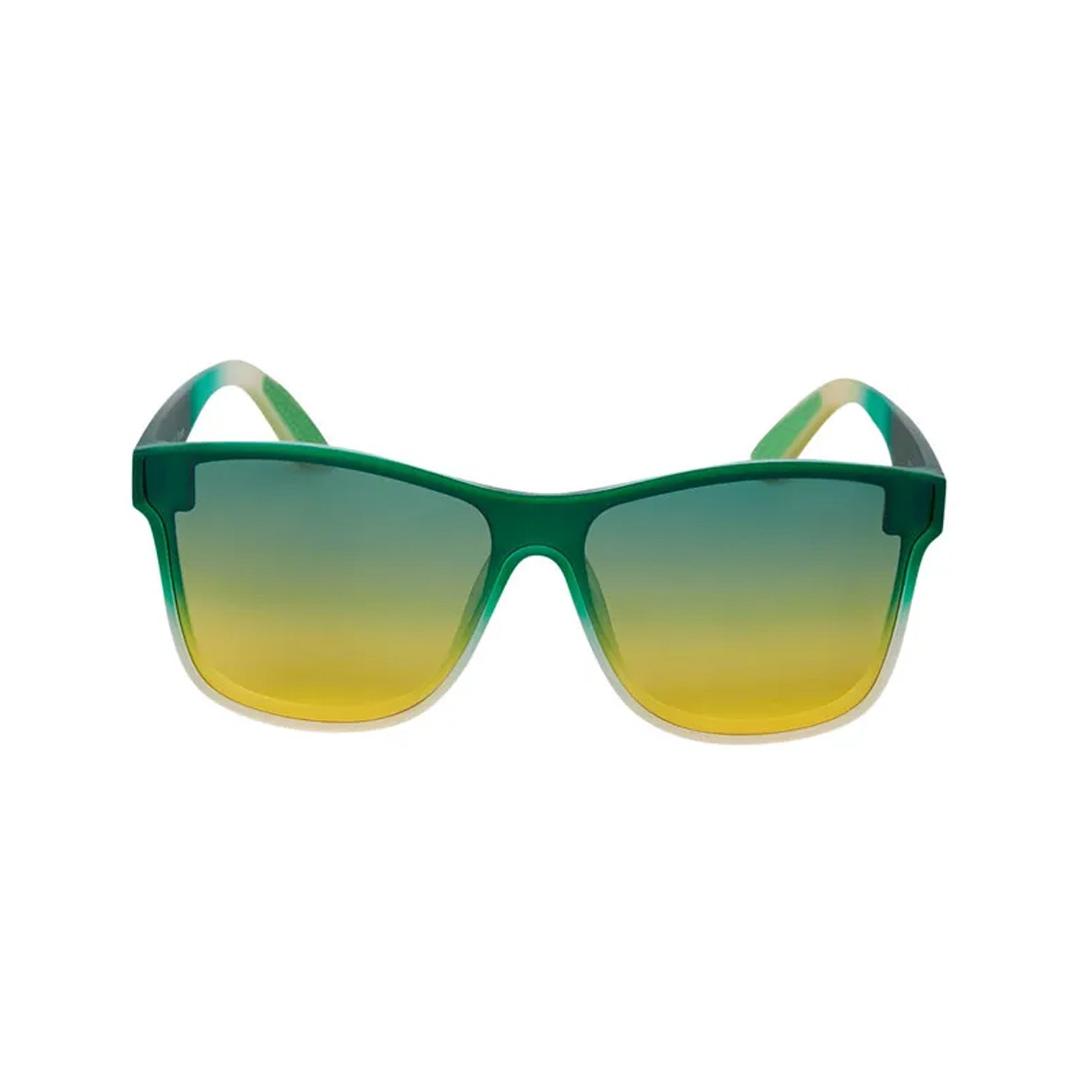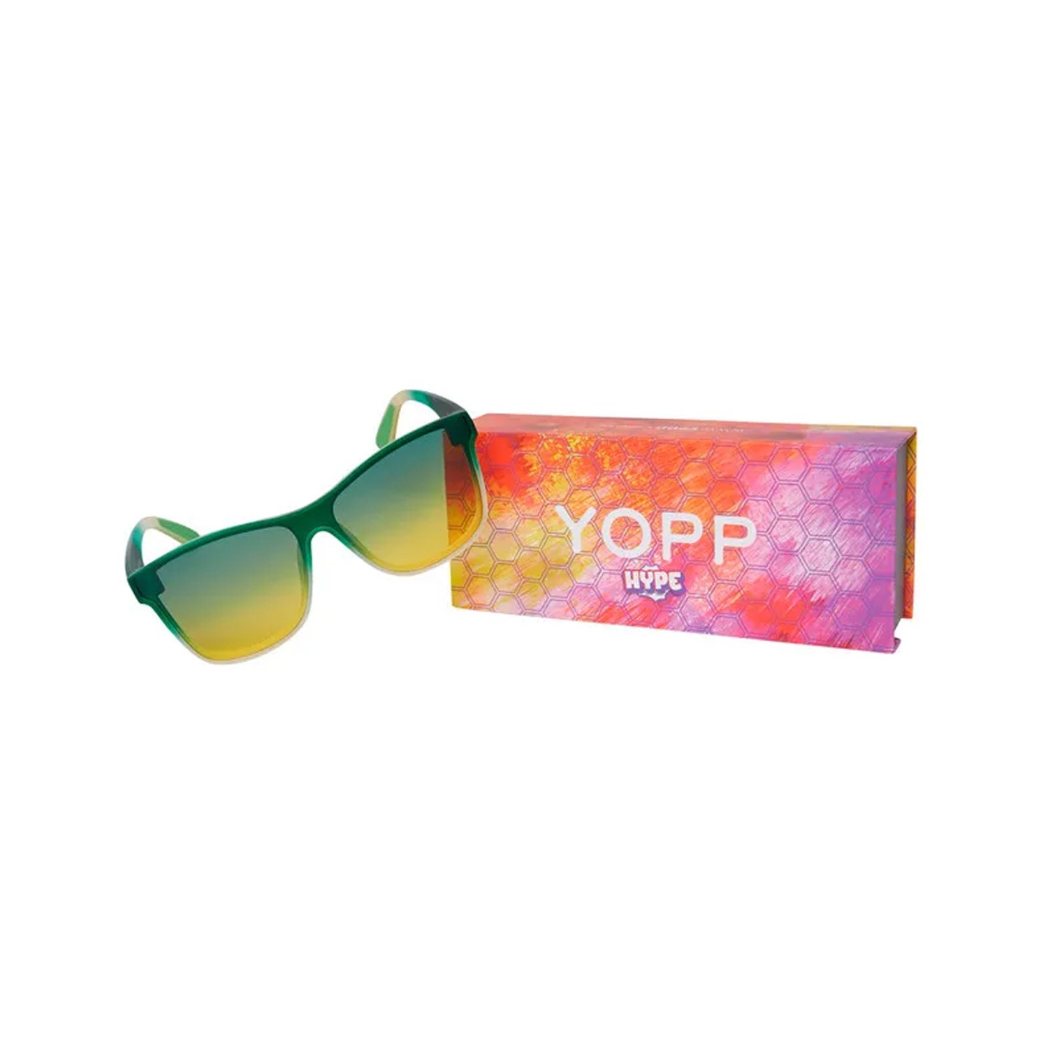 Óculos Yopp Hype Polarizado UV400 Tudo Nosso – estilo único, lentes amarelas degradê, armação verde/amarela e proteção total contra raios solares.