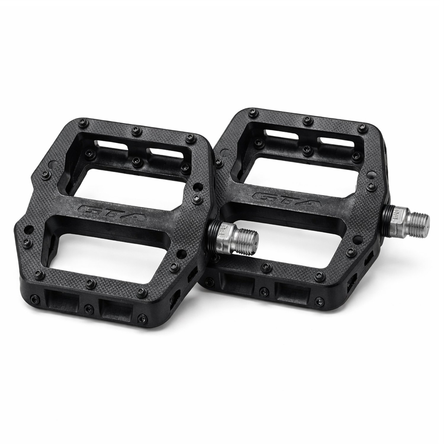 Pedal GTA plataforma 9/16 em nylon preto com eixo CR-MO CNC, 3 rolamentos selados e pinos removíveis. Ideal para bicicletas adultas.