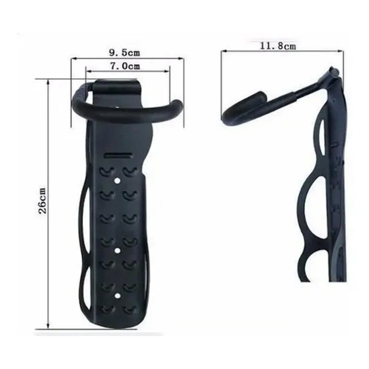 Feito em aço carbono durável, este suporte garante estabilidade e resistência, suportando até 25 kg. Com medidas ideais (largura da base 8 cm, comprimento da base 26 cm, altura total 15 cm, altura entre a base e o gancho 11 cm), ele é compatível com todos os tamanhos de aro, desde 12” até 700”.